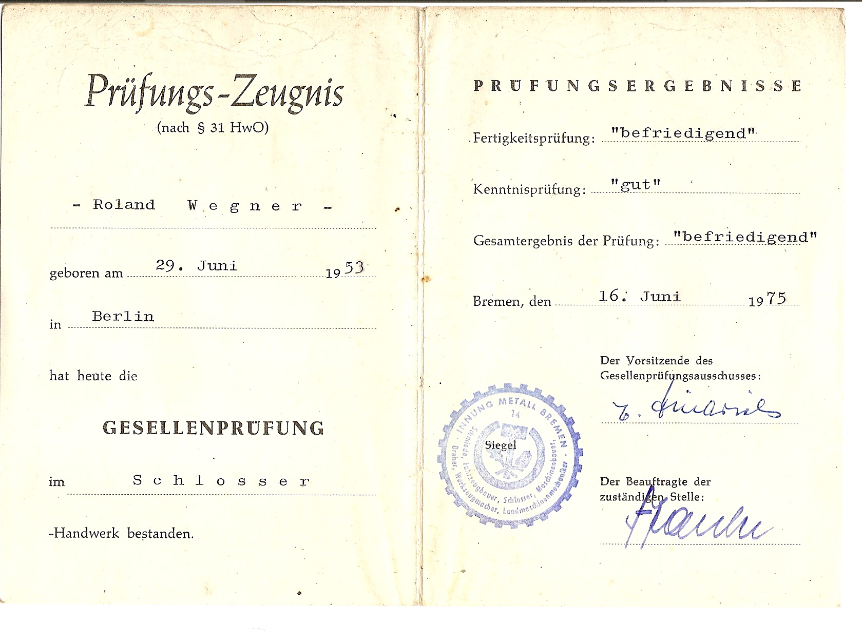 Abschluss: 16.Juni 1975 Gesellenbrief IHK Bremen